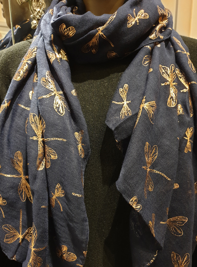 A fabulous seasonal fashion scarf. Navy in colour and highlighted with gorgeous metallic rose gold dragonflies.